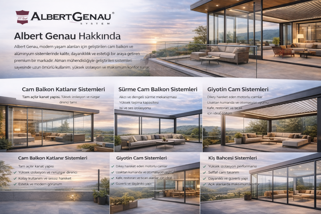 Albert Genau, modern yaşam alanları için geliştirilen cam balkon ve alüminyum sistemlerinde kalite, dayanıklılık ve estetiği bir araya getiren premium bir markadır. Alman mühendisliğiyle geliştirilen sistemleri sayesinde uzun ömürlü kullanım, yüksek yalıtım ve maksimum konfor sunar.