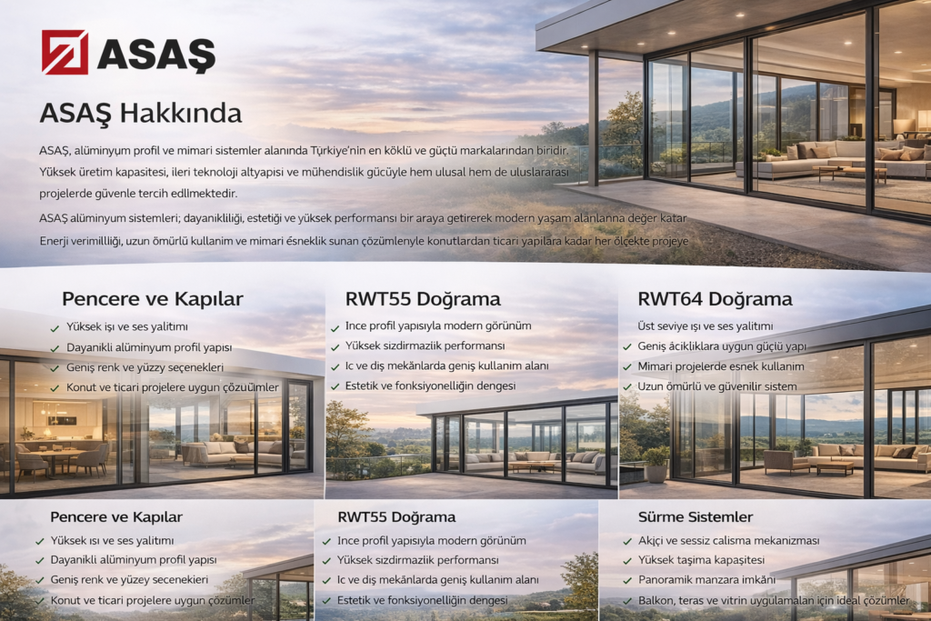 ASAŞ alüminyum sistemleri; dayanıklılık, estetik ve yüksek performansı bir araya getirerek modern yaşam alanlarına değer katar.