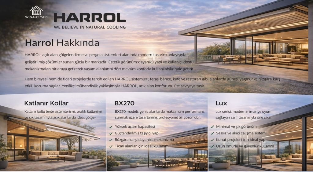 HARROL, açık alan gölgelendirme ve pergola sistemleri alanında modern tasarım anlayışıyla geliştirilmiş çözümler sunan güçlü bir markadır. Estetik görünüm, dayanıklı yapı ve kullanıcı dostu mekanizmaları bir araya getirerek yaşam alanlarını dört mevsim kullanılabilir hâle getirir.