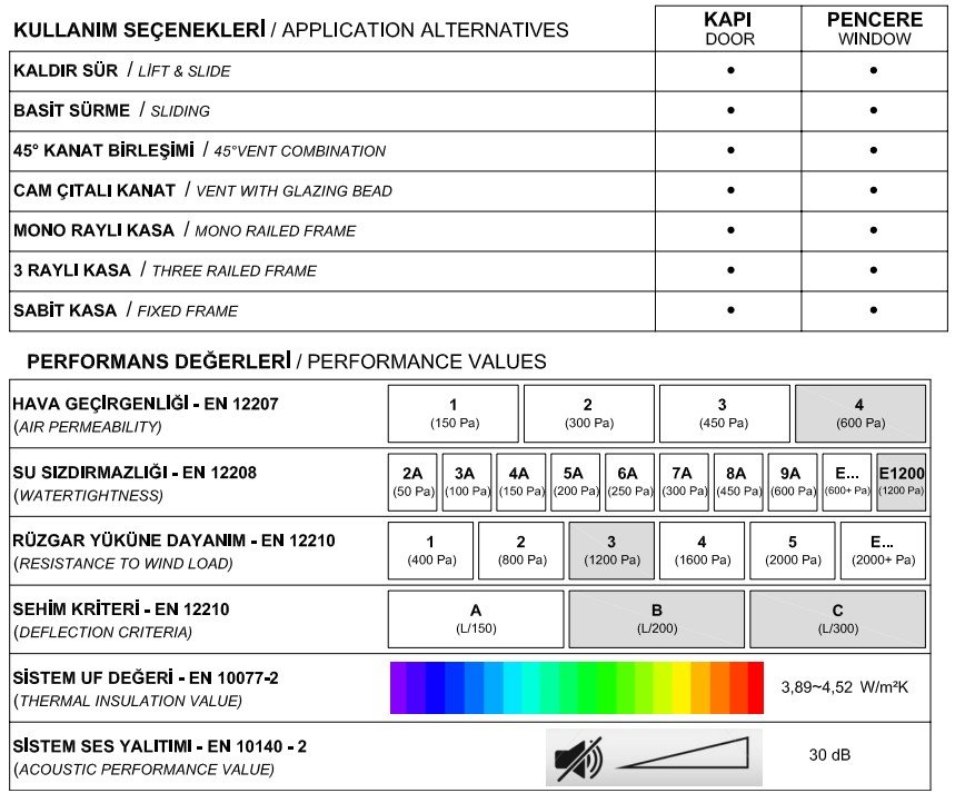 Kaldır sür ve basit sürme alternatifleri ile farklı kullanım seçeneklerine sahiptir. 116 mm kasa 52 mm kanat derinligi bulunmaktadır. Et kalınlığı 1,8/2 mm’dir. Kaldır Sür mekanizma kullanılabilirliği ile yüksek performans değerleri sağlar. Monoray, çift ray ve üç raylı kasa seçenekleri mevcuttur. Pervaz ve sineklik çözümleri ve yüksek kanat yapılabilirliğine imkan veren takviyeli profil seçeneği sunar. Oteller, is merkezleri, rezidanslar, özel konutlar ve alışveriş merkezler gibi projelerin sürme, kapı ve pencere uygulamalarında kullanılabilir.